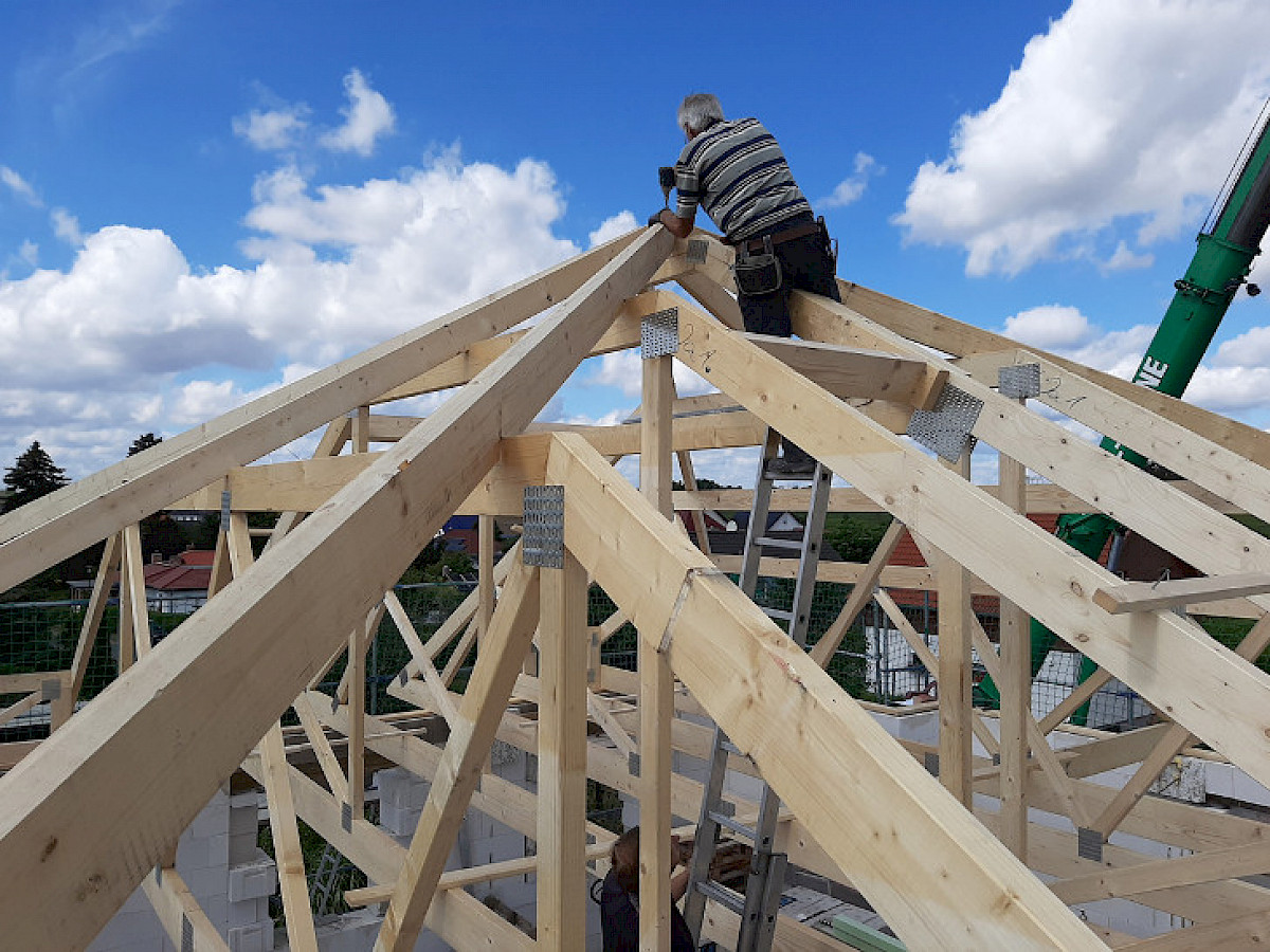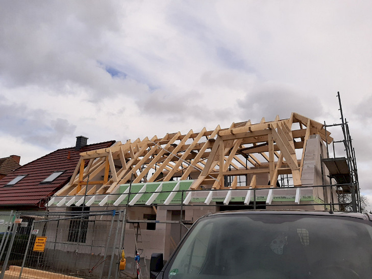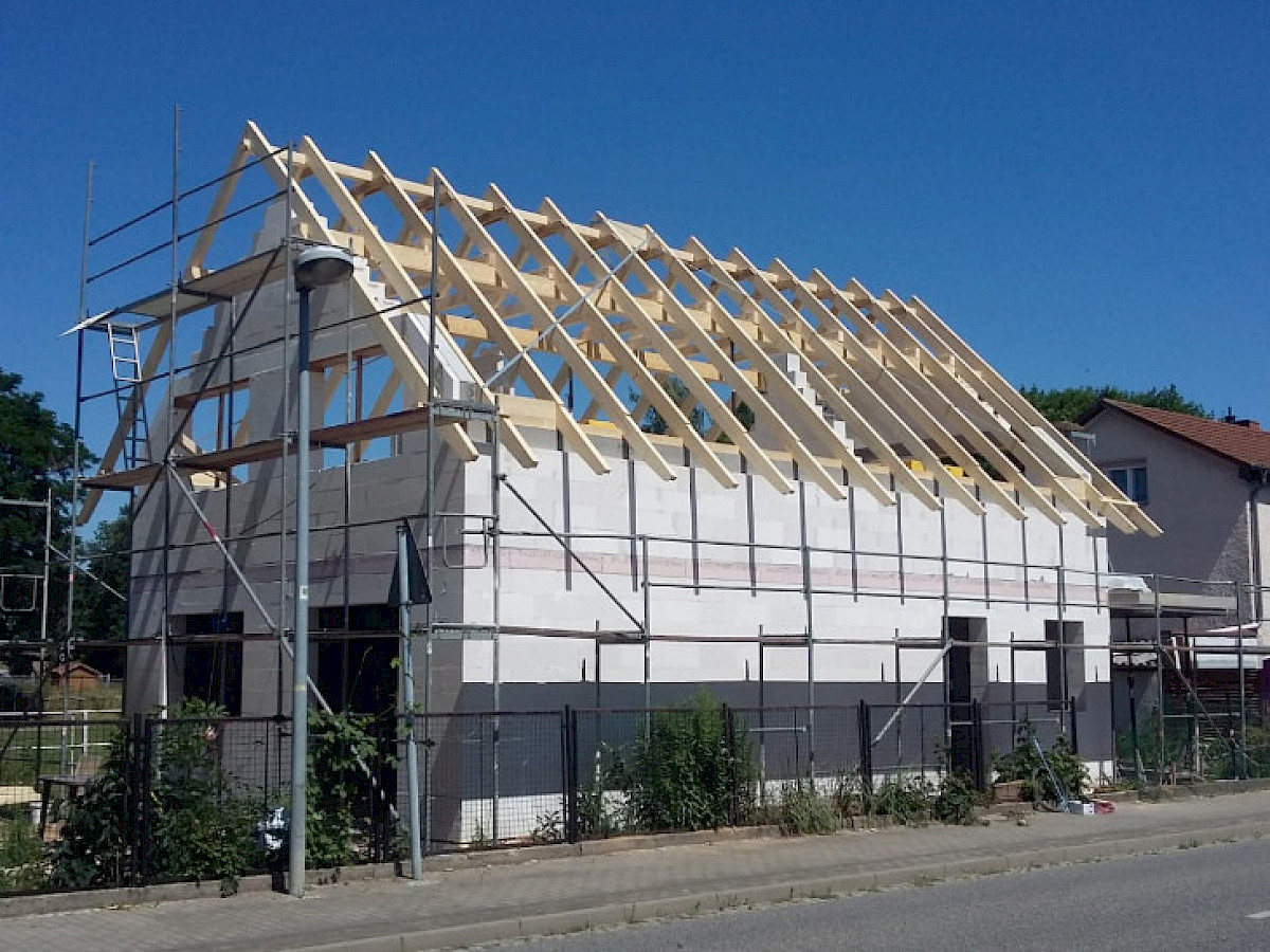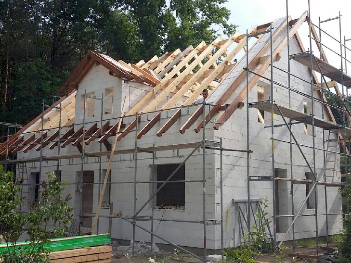 Wir bieten komplette Neubauten, Altbauten, Umbauten sowie Anbauten jeder Art, umfassende Renovierungen und auch Sanierungen an. Traditionell abgebundene Dachstühle stellen wir selbst her. Es können aber auch Binderdachstühle bestellt werden.